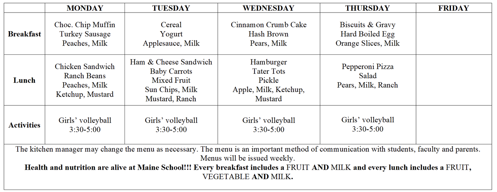 Please read the menu weekly, This will help keep you informed about events and information at Maine School. If you have any messages about the menu, please send them to the office by Tuesday. This institution is an equal opportunity provider.
